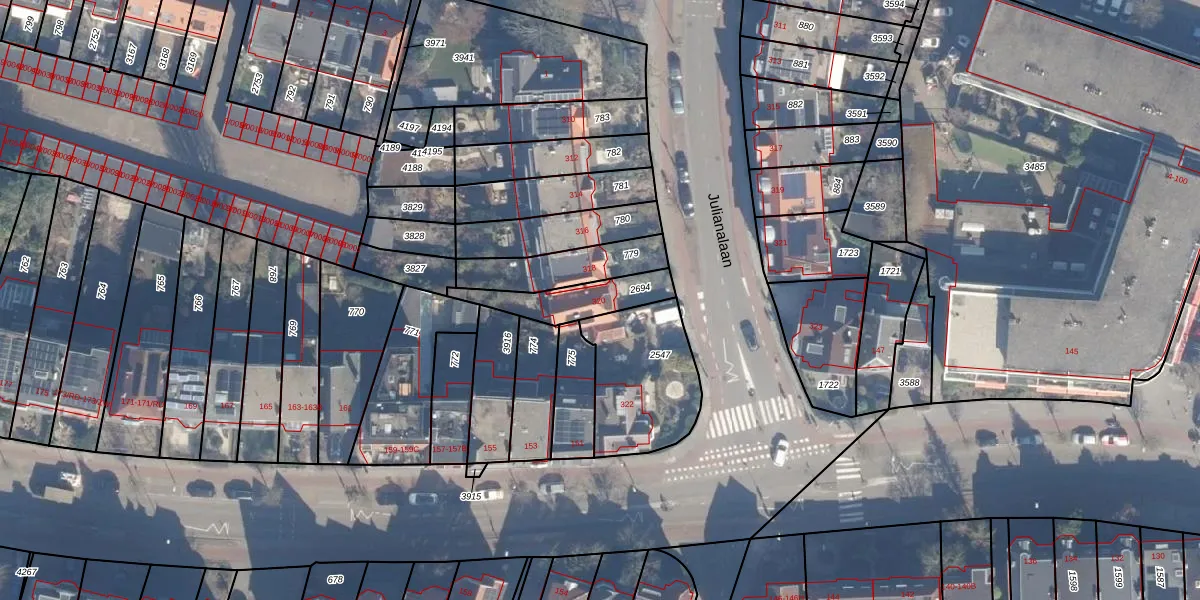 Julianalaan 320 is gelegen op kadastraal perceel HLM02T2694. Deze kadastrale aanduiding is uniek en wordt gebruikt door het Kadaster om eigendomsrechten en andere zakelijke rechten vast te leggen. Het perceel maakt onderdeel uit van de kadastrale gemeente Haarlem.
