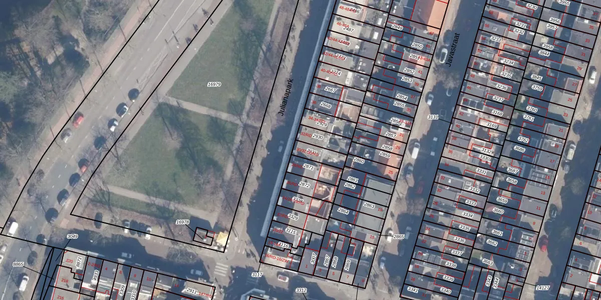 Het perceel waarop Julianapark 30-32 staat heeft een oppervlakte van 96 m². Dit is een klein perceel. De perceeloppervlakte wordt geregistreerd door het Kadaster. Gedetailleerde informatie over de maten van dit perceel kunt u vinden in het rapport Kadastrale kaart met maatvoering van Julianapark 30-32.