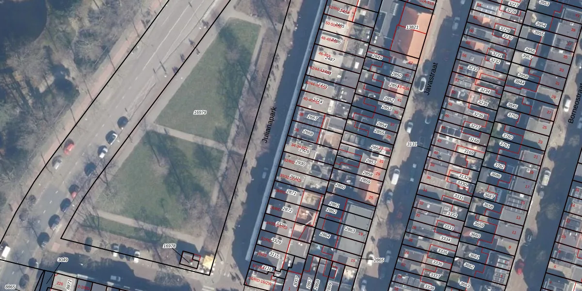 Het perceel waarop Julianapark 34 staat heeft een oppervlakte van 97 m². Dit is een klein perceel. De perceeloppervlakte wordt geregistreerd door het Kadaster. Gedetailleerde informatie over de maten van dit perceel kunt u vinden in het rapport Kadastrale kaart met maatvoering van Julianapark 34.