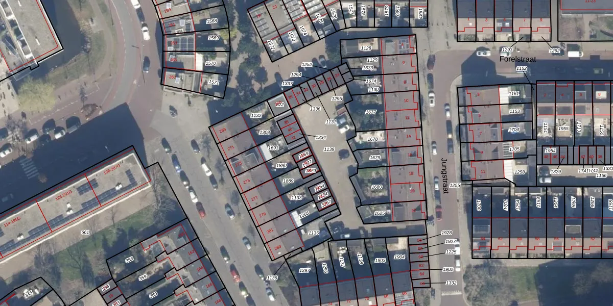 Het perceel waarop Jungstraat 44 staat heeft een oppervlakte van 17 m². Dit is een klein perceel. De perceeloppervlakte wordt geregistreerd door het Kadaster. Gedetailleerde informatie over de maten van dit perceel kunt u vinden in het rapport Kadastrale kaart met maatvoering van Jungstraat 44.
