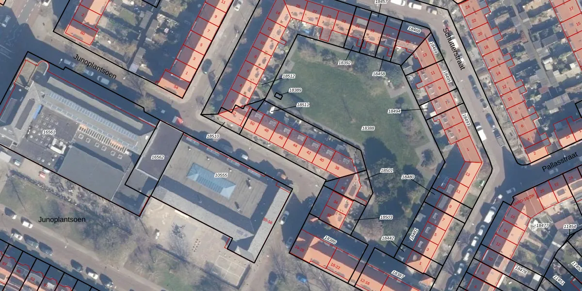 Junoplantsoen 44 is gelegen op kadastraal perceel STN01B18511. Deze kadastrale aanduiding is uniek en wordt gebruikt door het Kadaster om eigendomsrechten en andere zakelijke rechten vast te leggen. Het perceel maakt onderdeel uit van de kadastrale gemeente Schoten.