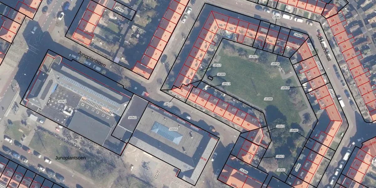 Junoplantsoen 50 is gelegen op kadastraal perceel STN01B18510. Deze kadastrale aanduiding is uniek en wordt gebruikt door het Kadaster om eigendomsrechten en andere zakelijke rechten vast te leggen. Het perceel maakt onderdeel uit van de kadastrale gemeente Schoten.