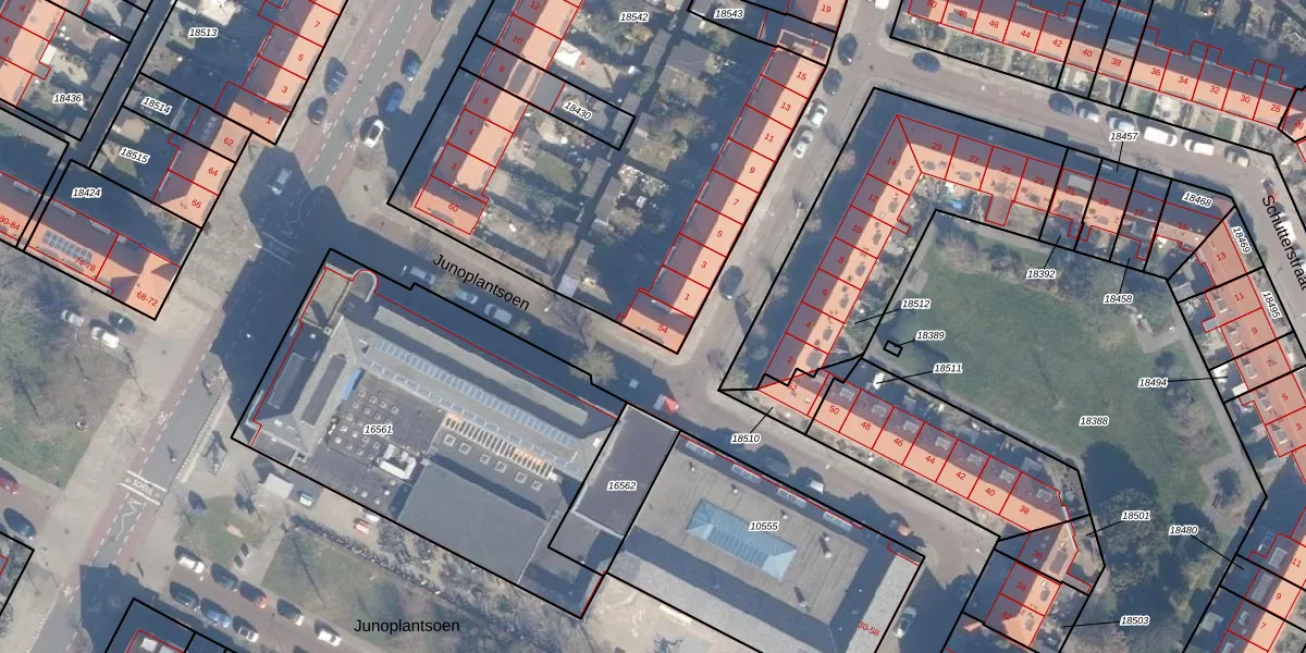 Junoplantsoen 54 is gelegen op kadastraal perceel STN01B18542. Deze kadastrale aanduiding is uniek en wordt gebruikt door het Kadaster om eigendomsrechten en andere zakelijke rechten vast te leggen. Het perceel maakt onderdeel uit van de kadastrale gemeente Schoten.