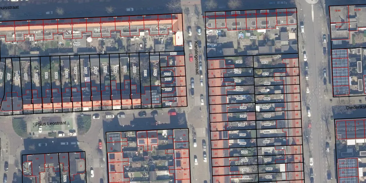 Het perceel waarop Karolingenstraat 12 staat heeft een oppervlakte van 76 m². Dit is een klein perceel. De perceeloppervlakte wordt geregistreerd door het Kadaster. Gedetailleerde informatie over de maten van dit perceel kunt u vinden in het rapport Kadastrale kaart met maatvoering van Karolingenstraat 12.