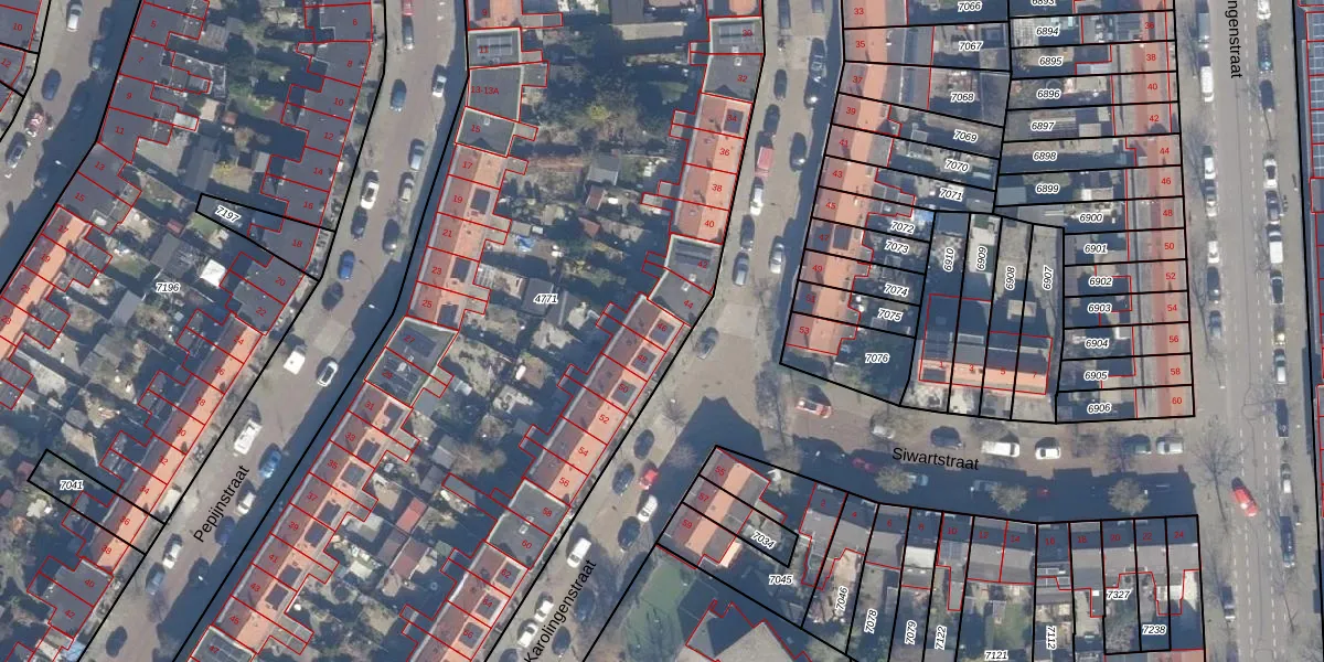 Het perceel waarop Karolingenstraat 46 staat heeft een oppervlakte van 7570 m². Dit is een zeer groot perceel. De perceeloppervlakte wordt geregistreerd door het Kadaster. Gedetailleerde informatie over de maten van dit perceel kunt u vinden in het rapport Kadastrale kaart met maatvoering van Karolingenstraat 46.