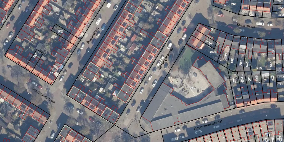 Het perceel waarop Karolingenstraat 68 staat heeft een oppervlakte van 7570 m². Dit is een zeer groot perceel. De perceeloppervlakte wordt geregistreerd door het Kadaster. Gedetailleerde informatie over de maten van dit perceel kunt u vinden in het rapport Kadastrale kaart met maatvoering van Karolingenstraat 68.