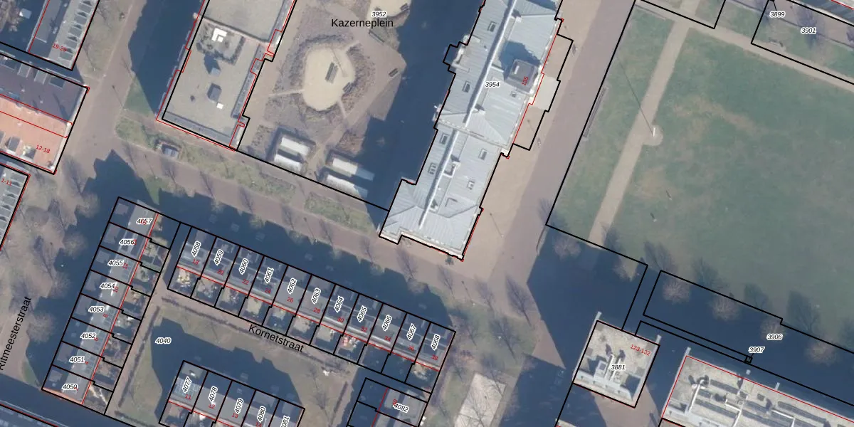 Kazerneplein 1 is gelegen op kadastraal perceel HLM01G3954. Deze kadastrale aanduiding is uniek en wordt gebruikt door het Kadaster om eigendomsrechten en andere zakelijke rechten vast te leggen. Het perceel maakt onderdeel uit van de kadastrale gemeente Haarlem.