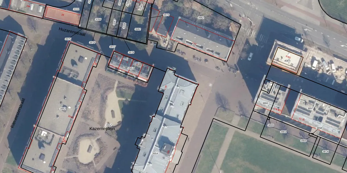 Het perceel waarop Kazerneplein 23 staat heeft een oppervlakte van 1728 m². Dit is een zeer groot perceel. De perceeloppervlakte wordt geregistreerd door het Kadaster. Gedetailleerde informatie over de maten van dit perceel kunt u vinden in het rapport Kadastrale kaart met maatvoering van Kazerneplein 23.
