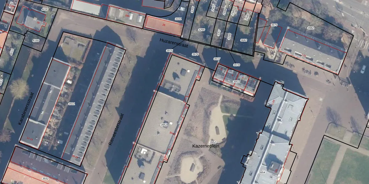 Het perceel waarop Kazerneplein 30 staat heeft een oppervlakte van 1465 m². Dit is een zeer groot perceel. De perceeloppervlakte wordt geregistreerd door het Kadaster. Gedetailleerde informatie over de maten van dit perceel kunt u vinden in het rapport Kadastrale kaart met maatvoering van Kazerneplein 30.