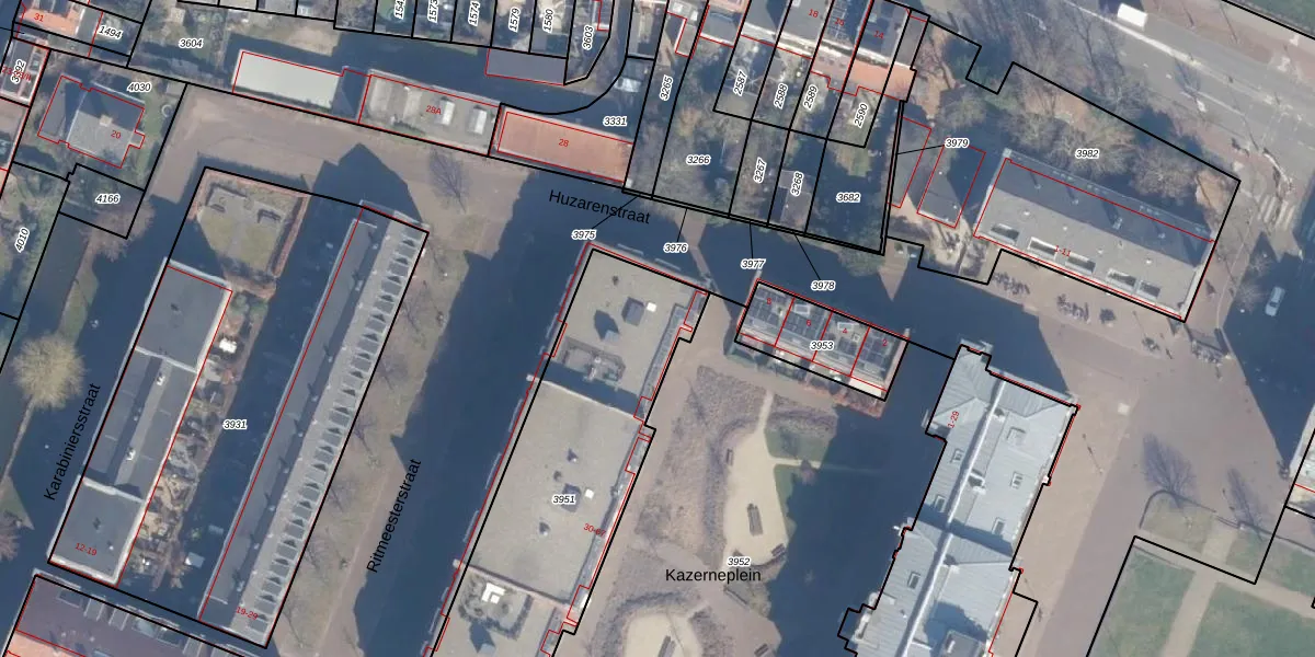 Het perceel waarop Kazerneplein 39 staat heeft een oppervlakte van 1465 m². Dit is een zeer groot perceel. De perceeloppervlakte wordt geregistreerd door het Kadaster. Gedetailleerde informatie over de maten van dit perceel kunt u vinden in het rapport Kadastrale kaart met maatvoering van Kazerneplein 39.
