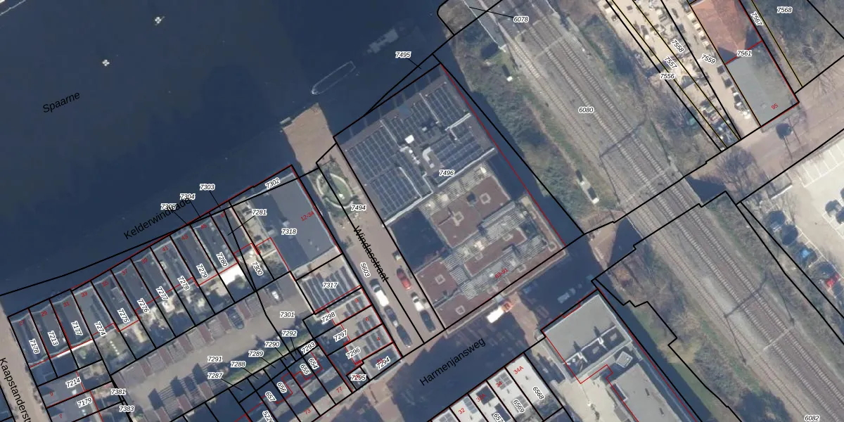 Het perceel waarop het adres ligt is HLM01-E-7496. De afkorting 'HLM01' staat voor kadastrale gemeente Haarlem. De oppervlakte van het perceel is 1843 m². Dat is groter dan gemiddeld in Haarlem, waar de gemiddelde perceeloppervlakte op 328,17 m² ligt. Het grootste perceel in de kadastrale gemeente is 13,9 ha. Het kleinste perceel heeft een oppervlakte van 0 m². Er zijn 56 adressen aanwezig op het perceel. De laatste wijziging in het de Basisregistratie Kadaster (BRK) was op 23-11-2020.