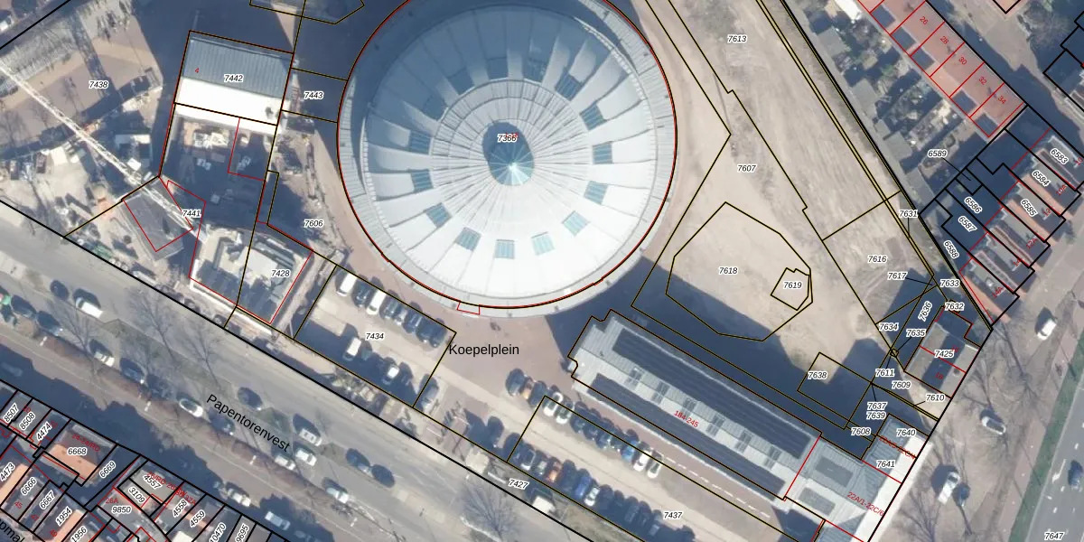 Het perceel waarop Koepelplein 1-E staat heeft een oppervlakte van 3094 m². Dit is een zeer groot perceel. De perceeloppervlakte wordt geregistreerd door het Kadaster. Gedetailleerde informatie over de maten van dit perceel kunt u vinden in het rapport Kadastrale kaart met maatvoering van Koepelplein 1-E.