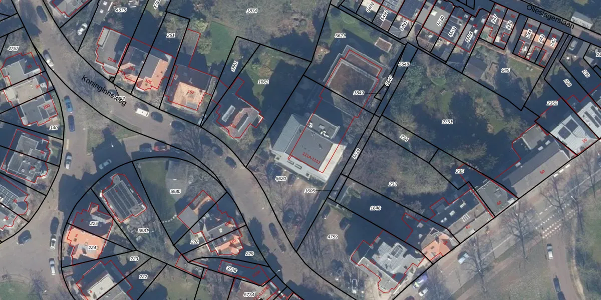 Koninginneweg 111-B is gelegen op kadastraal perceel HLM01I5620. Deze kadastrale aanduiding is uniek en wordt gebruikt door het Kadaster om eigendomsrechten en andere zakelijke rechten vast te leggen. Het perceel maakt onderdeel uit van de kadastrale gemeente Haarlem.