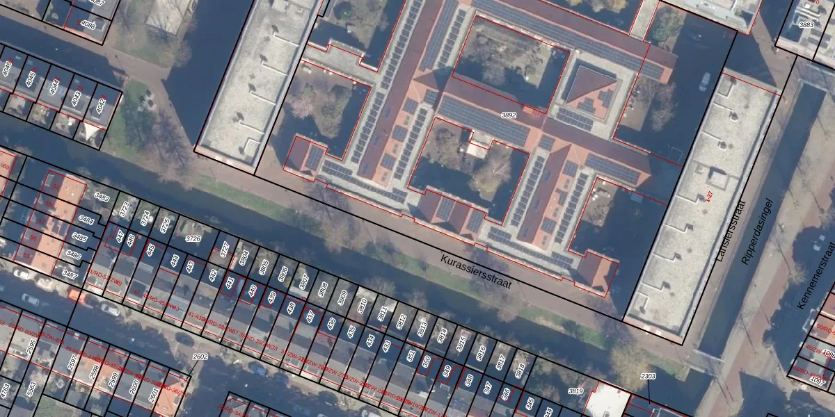 Het perceel waarop Kurassiersstraat 4 staat heeft een oppervlakte van 7033 m². Dit is een zeer groot perceel. De perceeloppervlakte wordt geregistreerd door het Kadaster. Gedetailleerde informatie over de maten van dit perceel kunt u vinden in het rapport Kadastrale kaart met maatvoering van Kurassiersstraat 4.