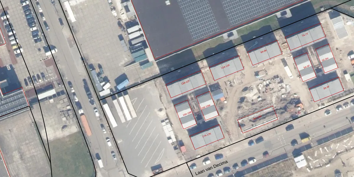 Het perceel waarop Laan van Decima 13-L staat heeft een oppervlakte van 8613 m². Dit is een zeer groot perceel. De perceeloppervlakte wordt geregistreerd door het Kadaster. Gedetailleerde informatie over de maten van dit perceel kunt u vinden in het rapport Kadastrale kaart met maatvoering van Laan van Decima 13-L.