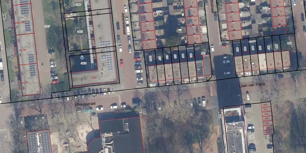 Gebruik de zoekbalk of klik op een perceel voor informatie over de adressen binnen dit perceel.