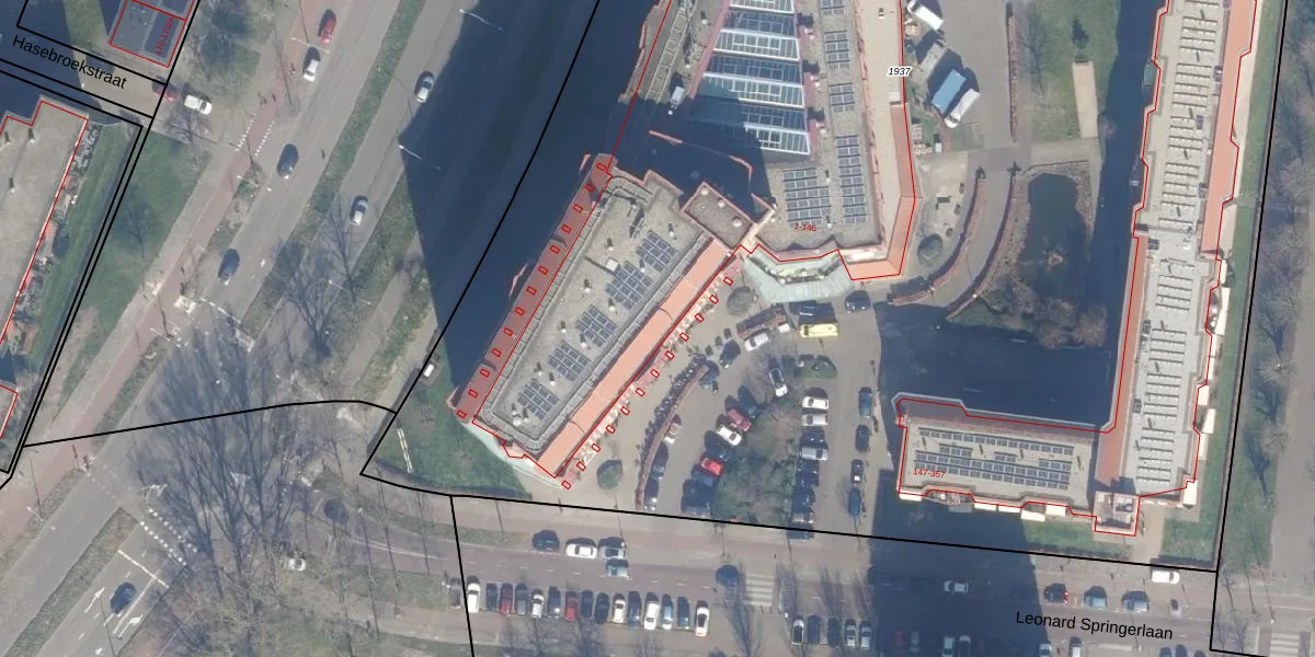 Het perceel waarop Leonard Springerlaan 13 staat heeft een oppervlakte van 1,5 ha. Dit is een zeer groot perceel. De perceeloppervlakte wordt geregistreerd door het Kadaster. Gedetailleerde informatie over de maten van dit perceel kunt u vinden in het rapport Kadastrale kaart met maatvoering van Leonard Springerlaan 13.
