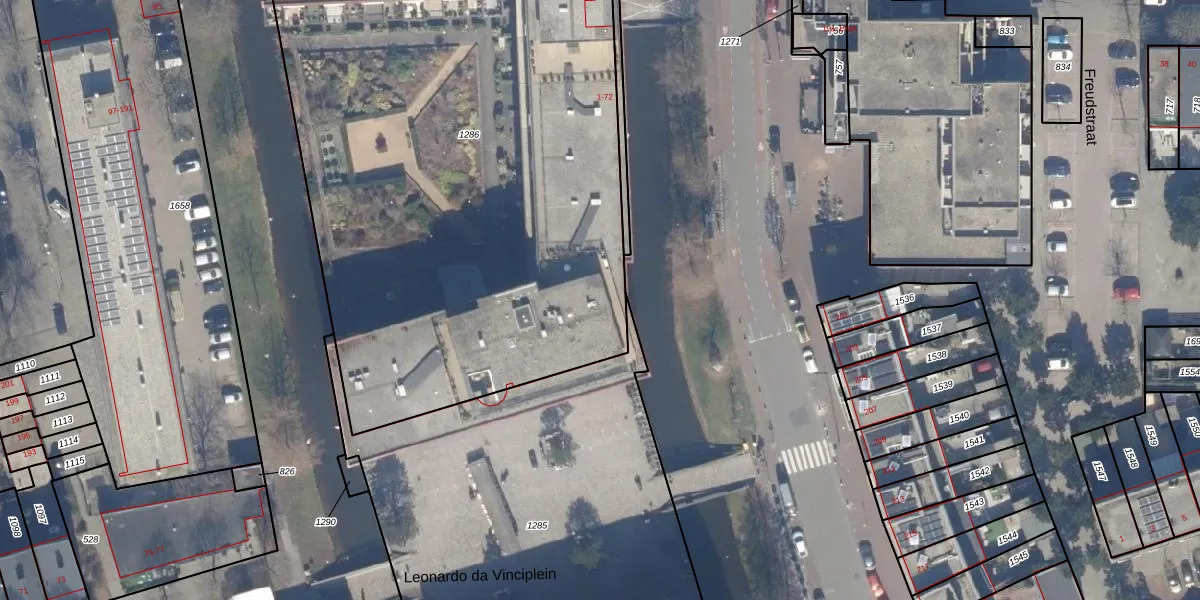 Het perceel waarop Leonardo da Vinciplein 54 staat heeft een oppervlakte van 4397 m². Dit is een zeer groot perceel. De perceeloppervlakte wordt geregistreerd door het Kadaster. Gedetailleerde informatie over de maten van dit perceel kunt u vinden in het rapport Kadastrale kaart met maatvoering van Leonardo da Vinciplein 54.