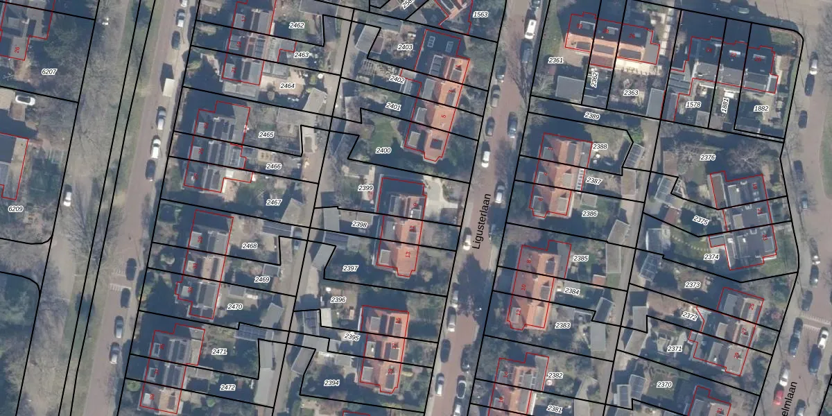 Het perceel waarop Ligusterlaan 9 staat heeft een oppervlakte van 445 m². Dit is een groot perceel. De perceeloppervlakte wordt geregistreerd door het Kadaster. Gedetailleerde informatie over de maten van dit perceel kunt u vinden in het rapport Kadastrale kaart met maatvoering van Ligusterlaan 9.