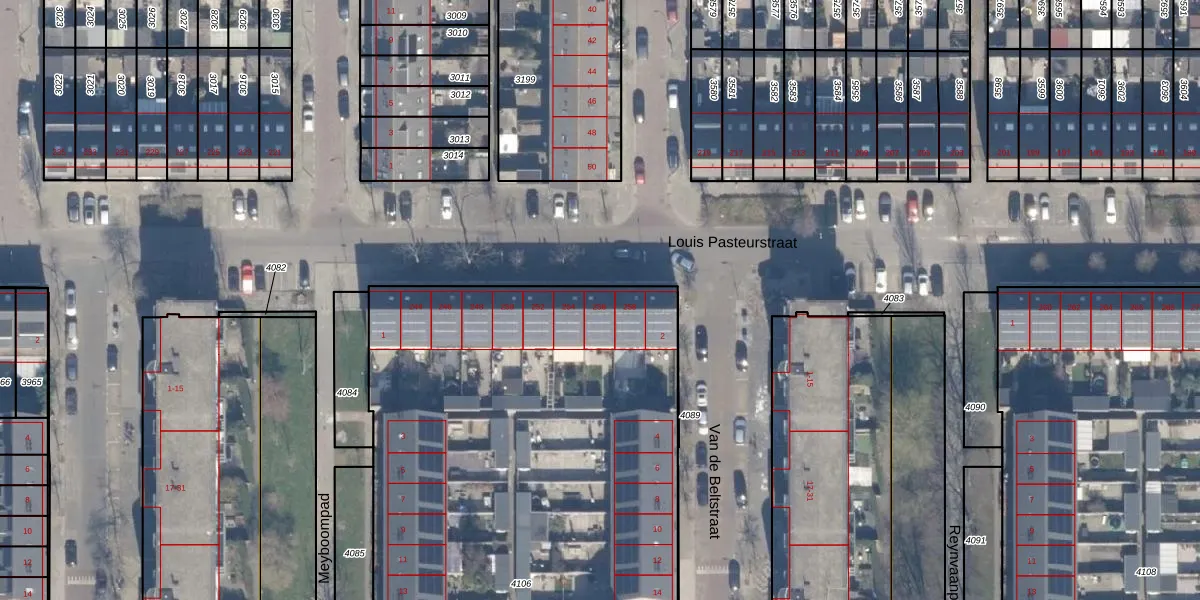 Louis Pasteurstraat 256 is gelegen op kadastraal perceel HLM02P4106. Deze kadastrale aanduiding is uniek en wordt gebruikt door het Kadaster om eigendomsrechten en andere zakelijke rechten vast te leggen. Het perceel maakt onderdeel uit van de kadastrale gemeente Haarlem.