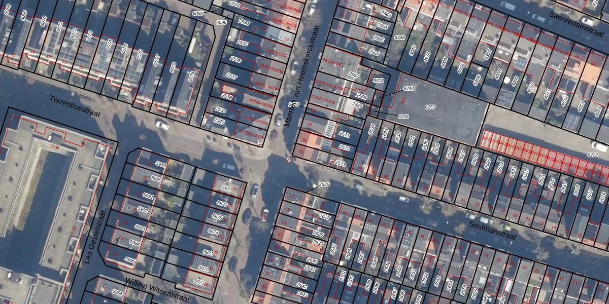 Het perceel waarop Maerten van Heemskerckstraat 59 staat heeft een oppervlakte van 87 m². Dit is een klein perceel. De perceeloppervlakte wordt geregistreerd door het Kadaster. Gedetailleerde informatie over de maten van dit perceel kunt u vinden in het rapport Kadastrale kaart met maatvoering van Maerten van Heemskerckstraat 59.