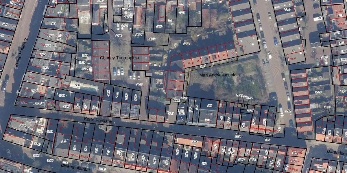 Het perceel waarop Mari Andriessenplein 52 staat heeft een oppervlakte van 2539 m². Dit is een zeer groot perceel. De perceeloppervlakte wordt geregistreerd door het Kadaster. Gedetailleerde informatie over de maten van dit perceel kunt u vinden in het rapport Kadastrale kaart met maatvoering van Mari Andriessenplein 52.
