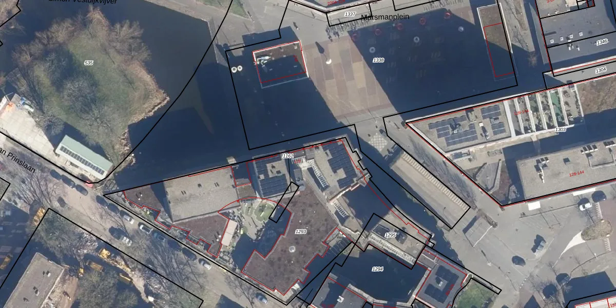 Het perceel waarop Marsmanplein 156 staat heeft een oppervlakte van 2608 m². Dit is een zeer groot perceel. De perceeloppervlakte wordt geregistreerd door het Kadaster. Gedetailleerde informatie over de maten van dit perceel kunt u vinden in het rapport Kadastrale kaart met maatvoering van Marsmanplein 156.