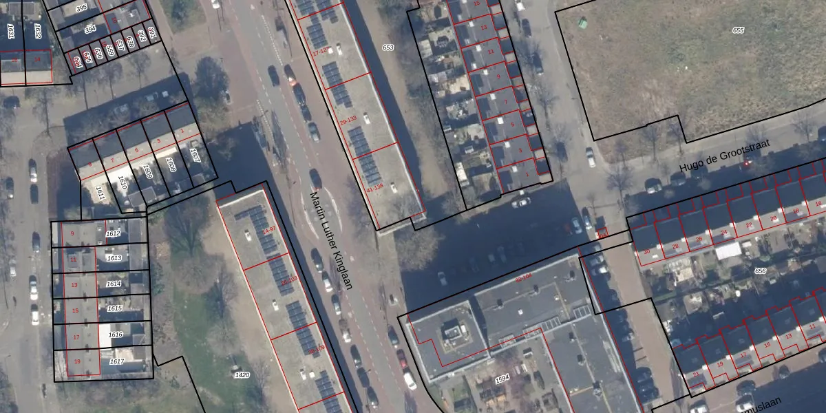 Het perceel waarop Martin Luther Kinglaan 138 staat heeft een oppervlakte van 2005 m². Dit is een zeer groot perceel. De perceeloppervlakte wordt geregistreerd door het Kadaster. Gedetailleerde informatie over de maten van dit perceel kunt u vinden in het rapport Kadastrale kaart met maatvoering van Martin Luther Kinglaan 138.