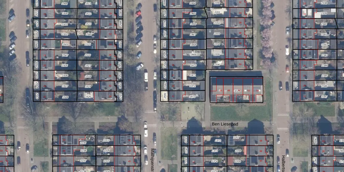 Het perceel waarop Mathijsenstraat 29 staat heeft een oppervlakte van 126 m². Dit is een middelgroot perceel. De perceeloppervlakte wordt geregistreerd door het Kadaster. Gedetailleerde informatie over de maten van dit perceel kunt u vinden in het rapport Kadastrale kaart met maatvoering van Mathijsenstraat 29.