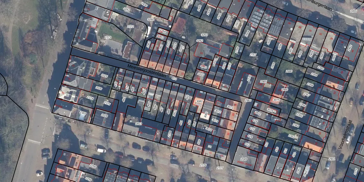 Het perceel waarop Meesterjoostenlaan 18 staat heeft een oppervlakte van 96 m². Dit is een klein perceel. De perceeloppervlakte wordt geregistreerd door het Kadaster. Gedetailleerde informatie over de maten van dit perceel kunt u vinden in het rapport Kadastrale kaart met maatvoering van Meesterjoostenlaan 18.