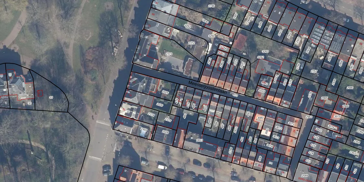 Het perceel waarop Meesterjoostenlaan 2 staat heeft een oppervlakte van 59 m². Dit is een klein perceel. De perceeloppervlakte wordt geregistreerd door het Kadaster. Gedetailleerde informatie over de maten van dit perceel kunt u vinden in het rapport Kadastrale kaart met maatvoering van Meesterjoostenlaan 2.