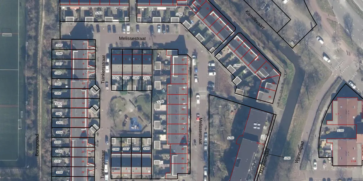 Het perceel waarop Melissestraat 16 staat heeft een oppervlakte van 1478 m². Dit is een zeer groot perceel. De perceeloppervlakte wordt geregistreerd door het Kadaster. Gedetailleerde informatie over de maten van dit perceel kunt u vinden in het rapport Kadastrale kaart met maatvoering van Melissestraat 16.