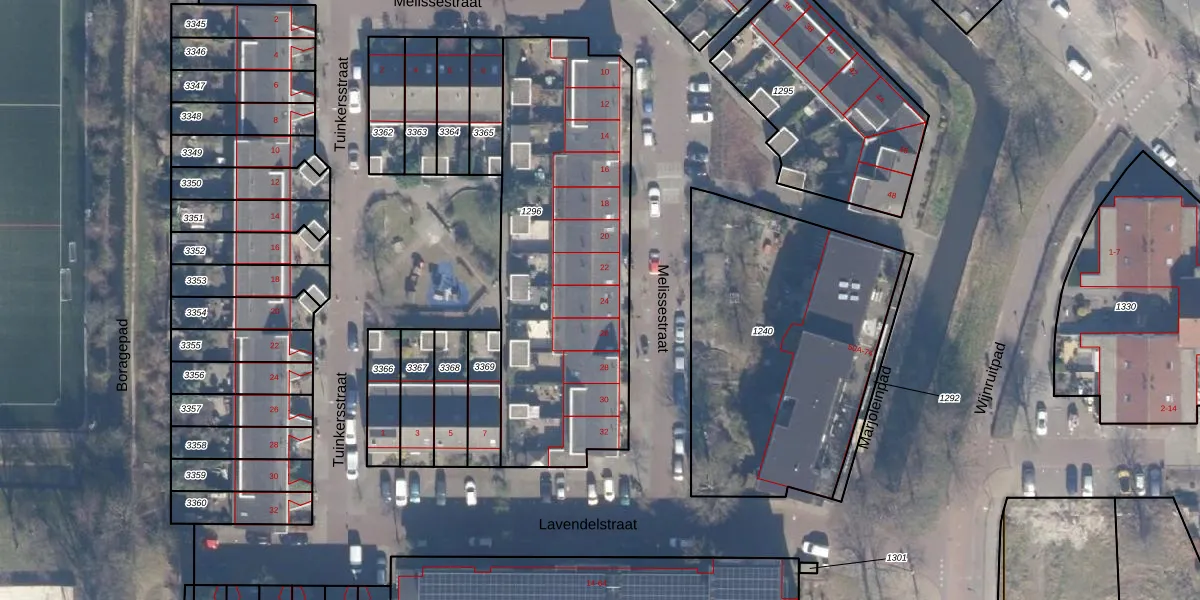 Het perceel waarop Melissestraat 24 staat heeft een oppervlakte van 1478 m². Dit is een zeer groot perceel. De perceeloppervlakte wordt geregistreerd door het Kadaster. Gedetailleerde informatie over de maten van dit perceel kunt u vinden in het rapport Kadastrale kaart met maatvoering van Melissestraat 24.