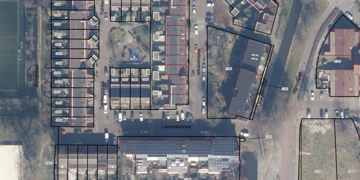 Het perceel waarop Melissestraat 30 staat heeft een oppervlakte van 1478 m². Dit is een zeer groot perceel. De perceeloppervlakte wordt geregistreerd door het Kadaster. Gedetailleerde informatie over de maten van dit perceel kunt u vinden in het rapport Kadastrale kaart met maatvoering van Melissestraat 30.