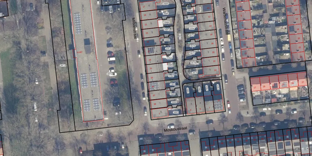 Milaanstraat 33 is gelegen op kadastraal perceel HLM02Y3360. Deze kadastrale aanduiding is uniek en wordt gebruikt door het Kadaster om eigendomsrechten en andere zakelijke rechten vast te leggen. Het perceel maakt onderdeel uit van de kadastrale gemeente Haarlem.