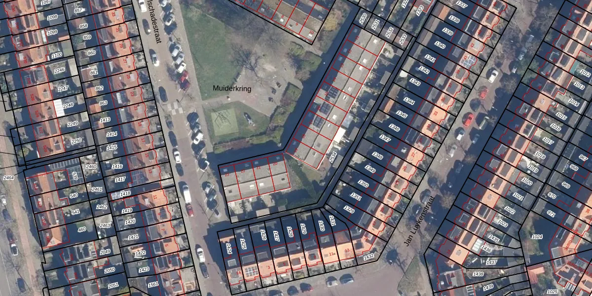 Het perceel waarop Muiderkring 19 staat heeft een oppervlakte van 1574 m². Dit is een zeer groot perceel. De perceeloppervlakte wordt geregistreerd door het Kadaster. Gedetailleerde informatie over de maten van dit perceel kunt u vinden in het rapport Kadastrale kaart met maatvoering van Muiderkring 19.