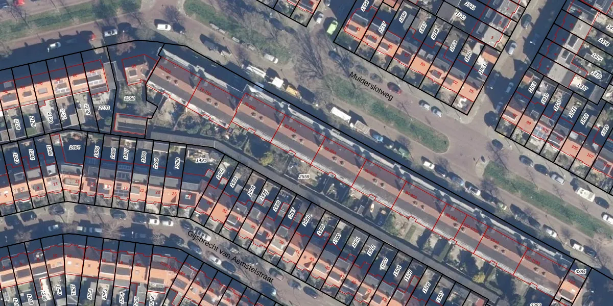 Het perceel waarop Muiderslotweg 84-I staat heeft een oppervlakte van 3877 m². Dit is een zeer groot perceel. De perceeloppervlakte wordt geregistreerd door het Kadaster. Gedetailleerde informatie over de maten van dit perceel kunt u vinden in het rapport Kadastrale kaart met maatvoering van Muiderslotweg 84-I.