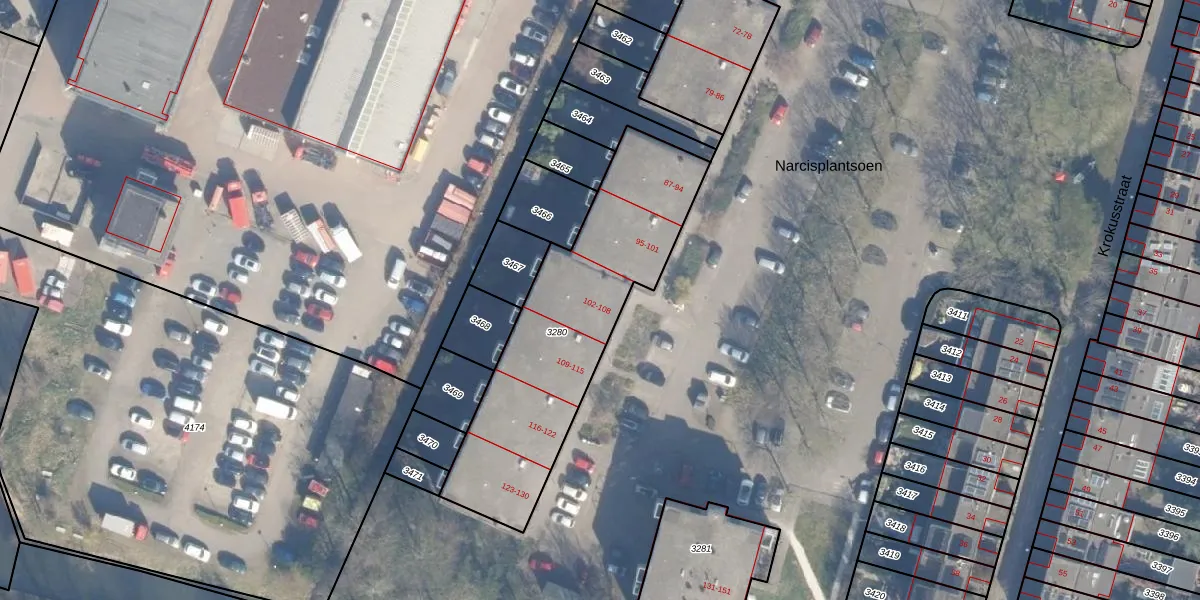 Het perceel waarop Narcisplantsoen 104 staat heeft een oppervlakte van 1053 m². Dit is een zeer groot perceel. De perceeloppervlakte wordt geregistreerd door het Kadaster. Gedetailleerde informatie over de maten van dit perceel kunt u vinden in het rapport Kadastrale kaart met maatvoering van Narcisplantsoen 104.