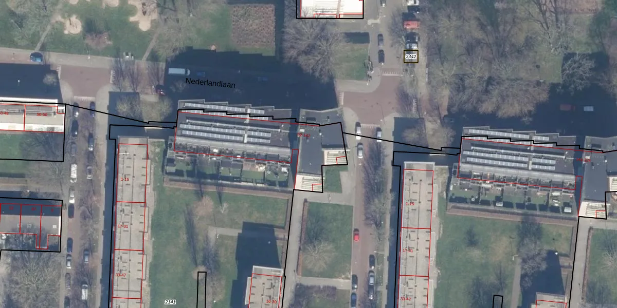 Het perceel waarop Nederlandlaan 114 staat heeft een oppervlakte van 6590 m². Dit is een zeer groot perceel. De perceeloppervlakte wordt geregistreerd door het Kadaster. Gedetailleerde informatie over de maten van dit perceel kunt u vinden in het rapport Kadastrale kaart met maatvoering van Nederlandlaan 114.