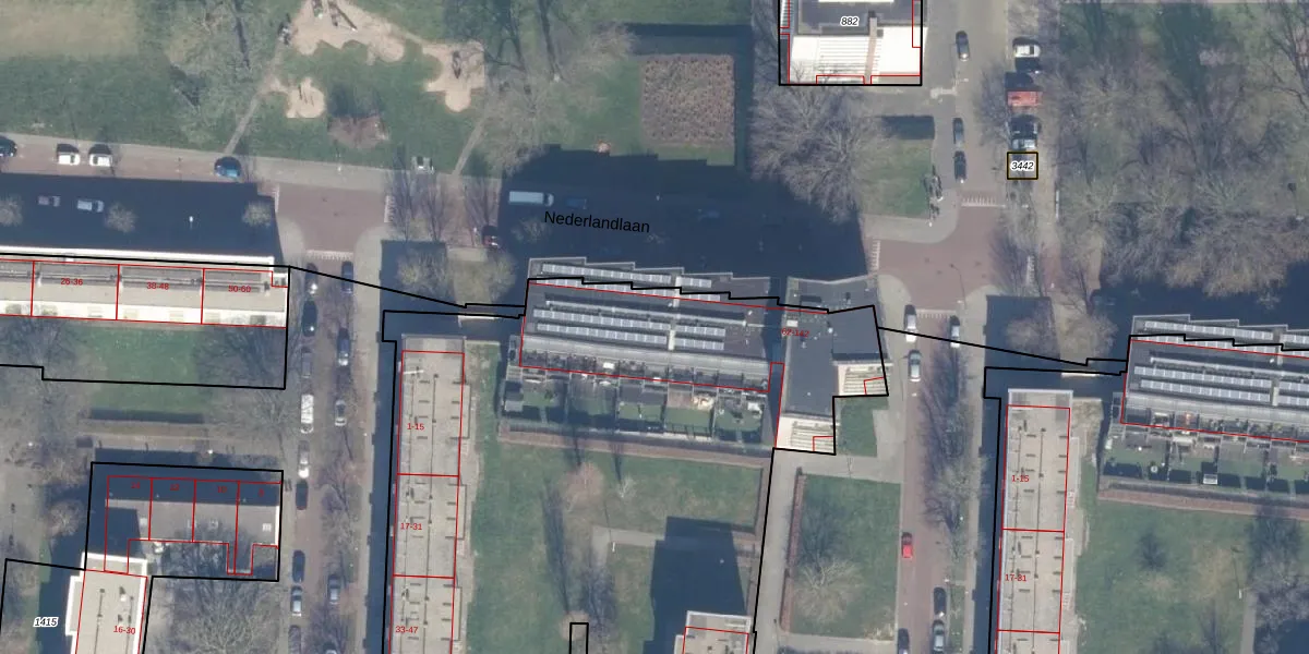 Het perceel waarop Nederlandlaan 94 staat heeft een oppervlakte van 6590 m². Dit is een zeer groot perceel. De perceeloppervlakte wordt geregistreerd door het Kadaster. Gedetailleerde informatie over de maten van dit perceel kunt u vinden in het rapport Kadastrale kaart met maatvoering van Nederlandlaan 94.