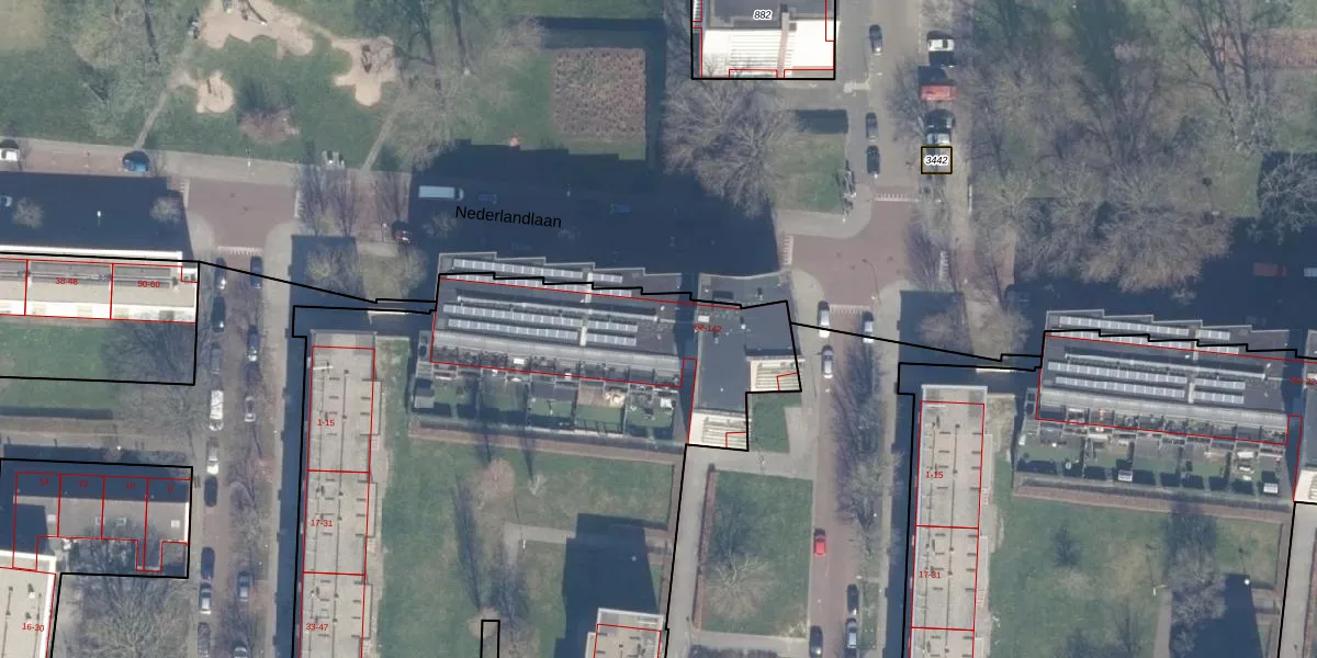 Het perceel waarop Nederlandlaan 98 staat heeft een oppervlakte van 6590 m². Dit is een zeer groot perceel. De perceeloppervlakte wordt geregistreerd door het Kadaster. Gedetailleerde informatie over de maten van dit perceel kunt u vinden in het rapport Kadastrale kaart met maatvoering van Nederlandlaan 98.