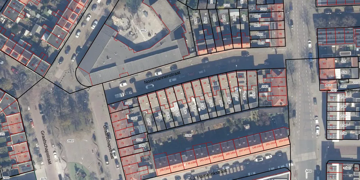 Het perceel waarop Noormannenstraat 10 staat heeft een oppervlakte van 114 m². Dit is een middelgroot perceel. De perceeloppervlakte wordt geregistreerd door het Kadaster. Gedetailleerde informatie over de maten van dit perceel kunt u vinden in het rapport Kadastrale kaart met maatvoering van Noormannenstraat 10.