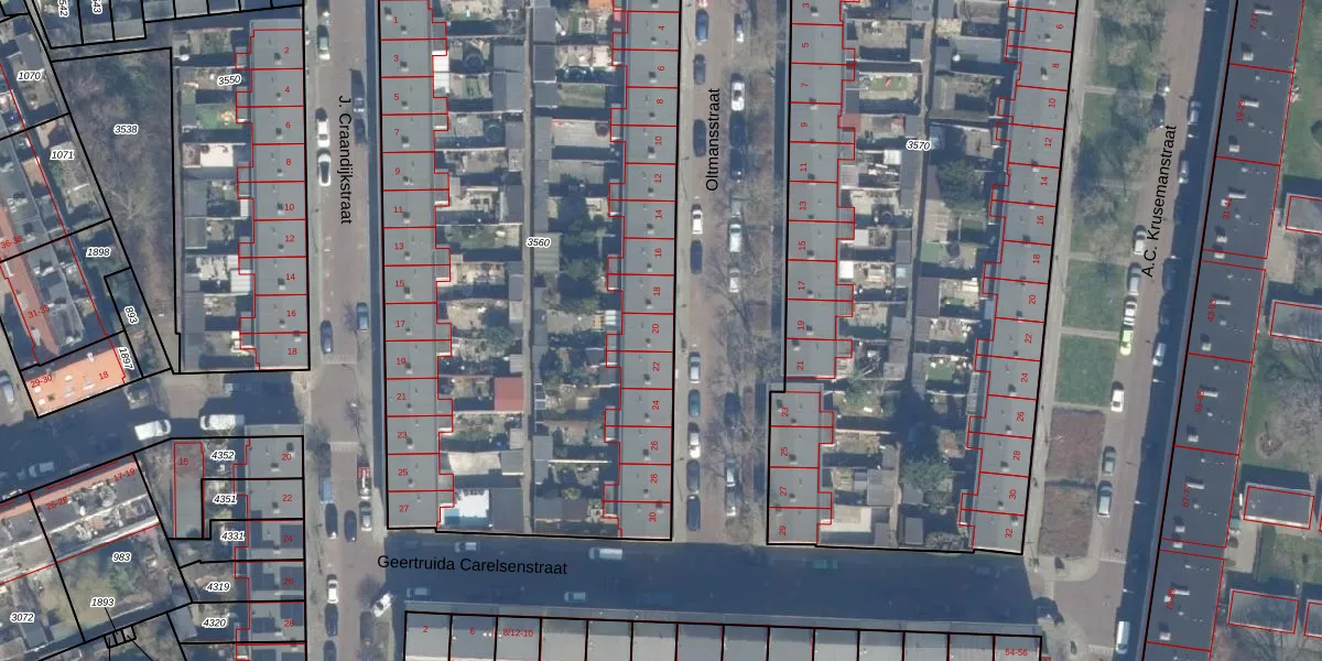 Het perceel waarop Oltmansstraat 20 staat heeft een oppervlakte van 3774 m². Dit is een zeer groot perceel. De perceeloppervlakte wordt geregistreerd door het Kadaster. Gedetailleerde informatie over de maten van dit perceel kunt u vinden in het rapport Kadastrale kaart met maatvoering van Oltmansstraat 20.