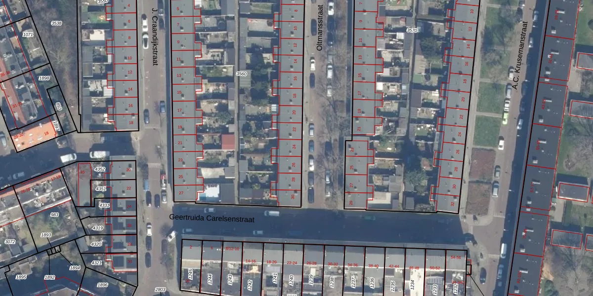 Het perceel waarop Oltmansstraat 24 staat heeft een oppervlakte van 3774 m². Dit is een zeer groot perceel. De perceeloppervlakte wordt geregistreerd door het Kadaster. Gedetailleerde informatie over de maten van dit perceel kunt u vinden in het rapport Kadastrale kaart met maatvoering van Oltmansstraat 24.