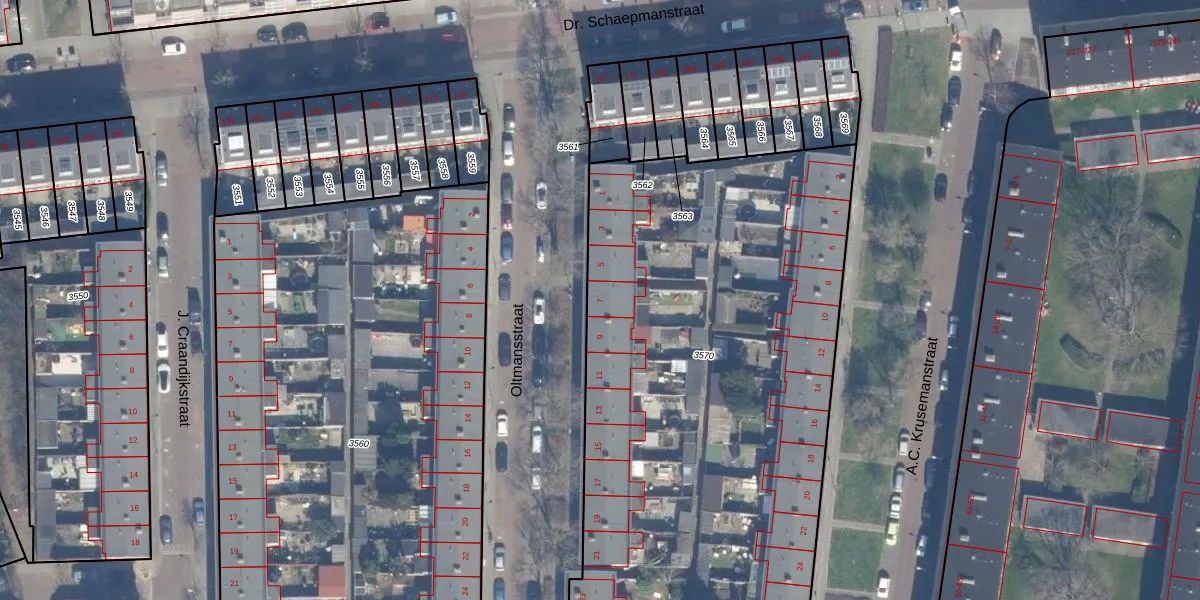 Het perceel waarop Oltmansstraat 7 staat heeft een oppervlakte van 3858 m². Dit is een zeer groot perceel. De perceeloppervlakte wordt geregistreerd door het Kadaster. Gedetailleerde informatie over de maten van dit perceel kunt u vinden in het rapport Kadastrale kaart met maatvoering van Oltmansstraat 7.