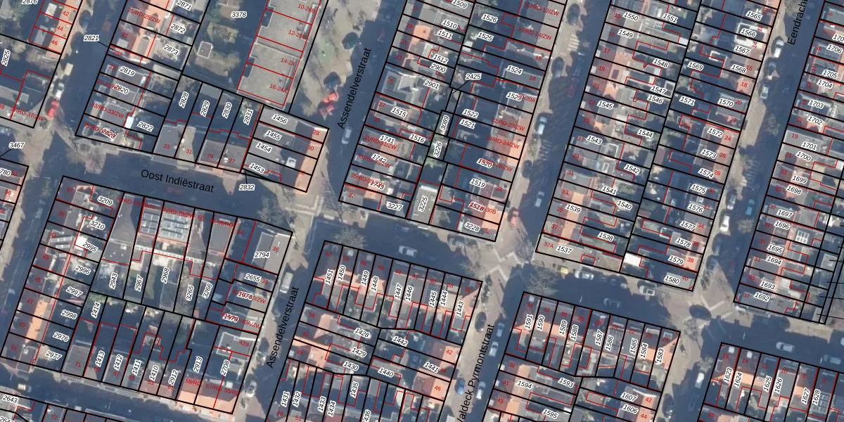 Het perceel waarop Oost Indiëstraat 1 staat heeft een oppervlakte van 84 m². Dit is een klein perceel. De perceeloppervlakte wordt geregistreerd door het Kadaster. Gedetailleerde informatie over de maten van dit perceel kunt u vinden in het rapport Kadastrale kaart met maatvoering van Oost Indiëstraat 1.