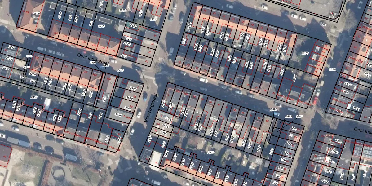Oost Indiëstraat 100 is gelegen op kadastraal perceel HLM01H2582. Deze kadastrale aanduiding is uniek en wordt gebruikt door het Kadaster om eigendomsrechten en andere zakelijke rechten vast te leggen. Het perceel maakt onderdeel uit van de kadastrale gemeente Haarlem.