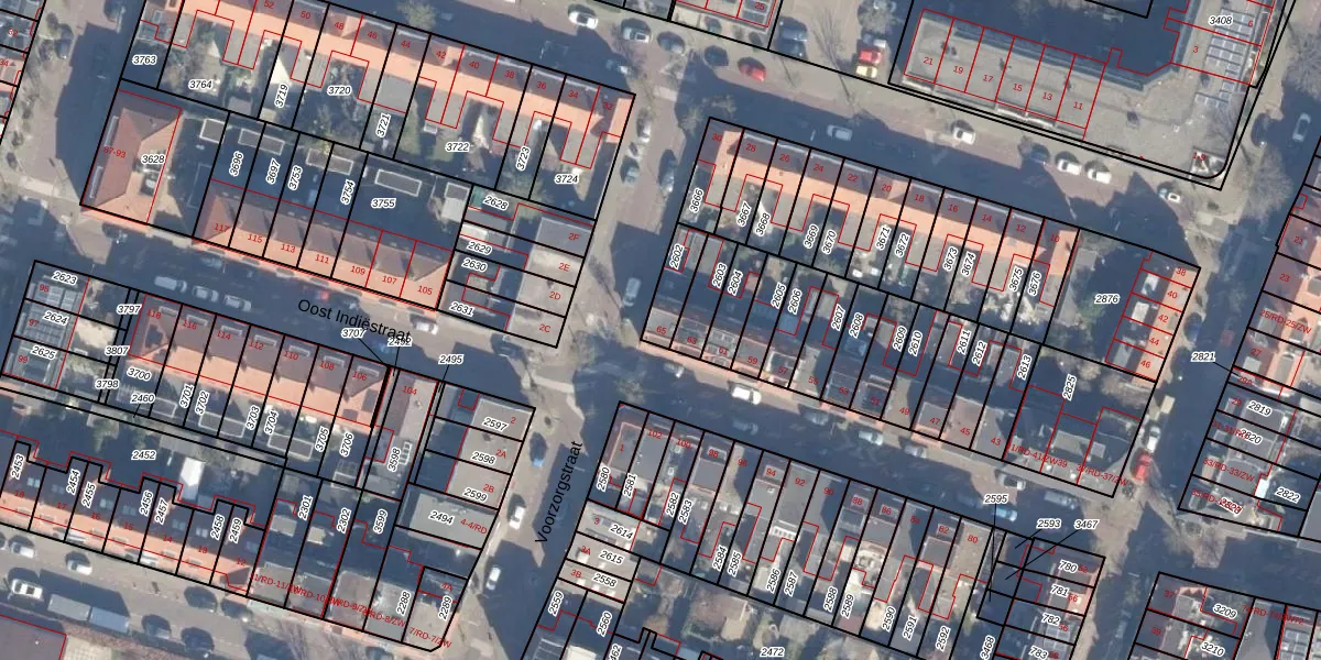 Het perceel waarop Oost Indiëstraat 65 staat heeft een oppervlakte van 94 m². Dit is een klein perceel. De perceeloppervlakte wordt geregistreerd door het Kadaster. Gedetailleerde informatie over de maten van dit perceel kunt u vinden in het rapport Kadastrale kaart met maatvoering van Oost Indiëstraat 65.