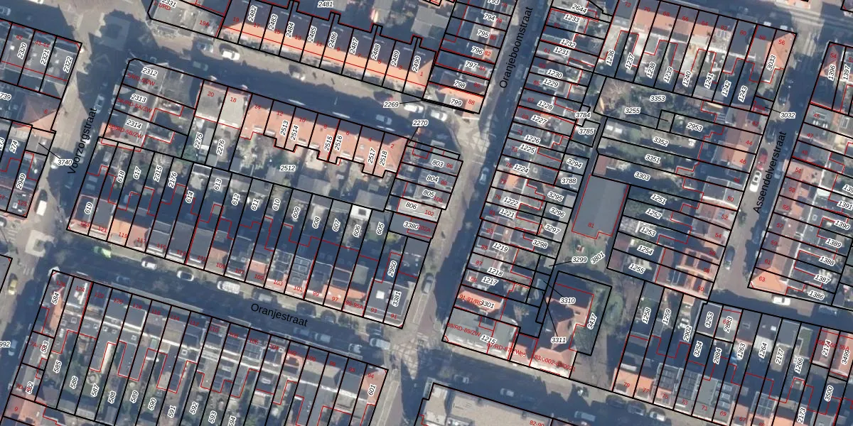 Het perceel waarop Oranjeboomstraat 102 staat heeft een oppervlakte van 45 m². Dit is een klein perceel. De perceeloppervlakte wordt geregistreerd door het Kadaster. Gedetailleerde informatie over de maten van dit perceel kunt u vinden in het rapport Kadastrale kaart met maatvoering van Oranjeboomstraat 102.