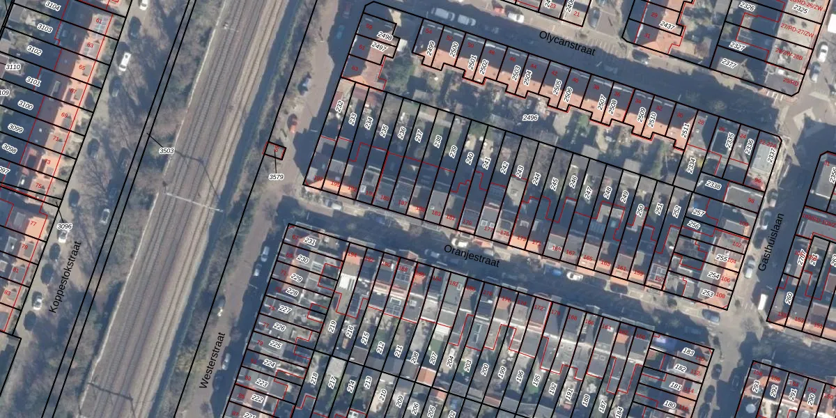 Oranjestraat 185 is gelegen op kadastraal perceel HLM01H238. Deze kadastrale aanduiding is uniek en wordt gebruikt door het Kadaster om eigendomsrechten en andere zakelijke rechten vast te leggen. Het perceel maakt onderdeel uit van de kadastrale gemeente Haarlem.
